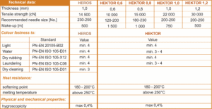 HEROS 1,0 – idealiai tinka pado apsiuvimui, jungiamųjų ir dekoratyvinių siūlių darymui avalynėje, baldų apmušalų dygsniavimui, rankiniam siuvimui, kraštų siuvimui bei burių siuvimui.